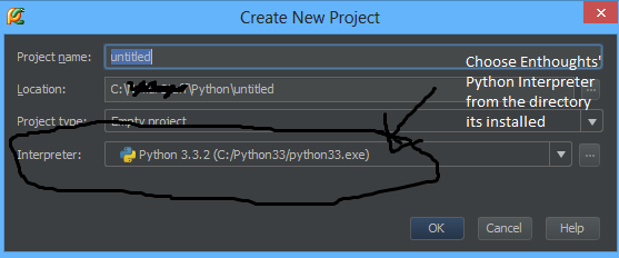 在创建新项目时,需要找到安装enthought的位置,并将Python.exe链接到解释器框,如下所示: