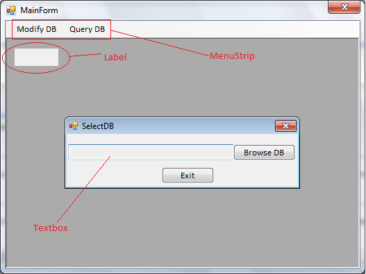 我有一个名为MDIParent的MainForm表单。它有一个名为SelectDB的子表单。在SelectDB表单中,我有一个按钮,单击该按钮将打开FileDialog以浏览和选择.MDB文件。文件的路径显示在TextBox中。获得.MDB文件后,子窗体关闭,MainForm可见。在MainForm上,我有一个标签,它应该显示我在文本框中得到的路径。而且,当孩子的表格打开的时候。菜单条也应该禁用,或者您可以说MDI表单中的所有控件都应该禁用。