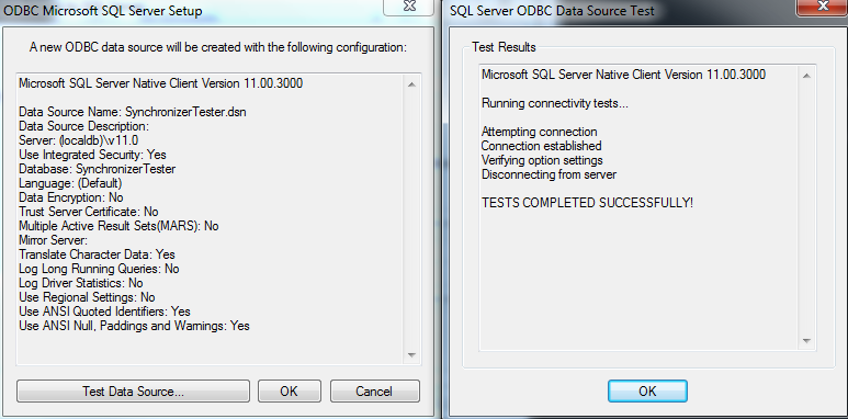 但是在我的项目中,当我使用这个连接字符串"Driver=SQL Server Native Client 11.0;DATABASE=SynchronizerTester;Trusted_Connection=Yes;SERVER=(localdb)\v11.0;"时,我得到一个System.Data.Odbc.OdbcException,命名管道无法打开连接等等。