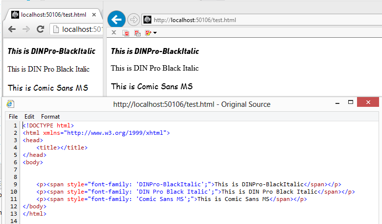 2)更糟糕的是,如果我试图在桌面应用程序和网络上呈现相同的字体,像Windows ,甚至IE这样的浏览器都会期望“DINPro-Black意大利语”,不会呈现出这个名字的间隔版本。WPF和windows浏览器似乎使相互排斥的决定使用哪个字体名来索引字体。对于任意字体,我如何解决这个问题?