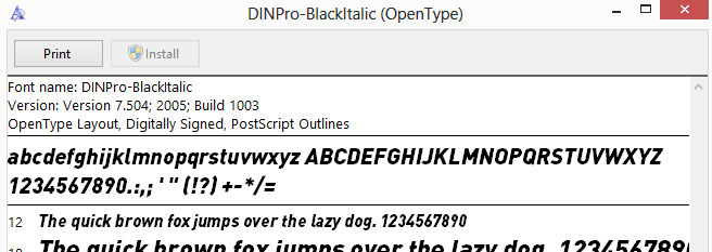 我无法确定如何在WPF中正确呈现特定的OpenType字体(.NET 4.5 / VS2012 / Windows 8)。我的电脑上安装了一种名为“DINPro-黑色意大利”的字体。