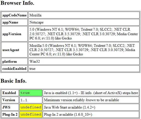 Enabled true Java is enabled (1.1+) - IE info. stops here