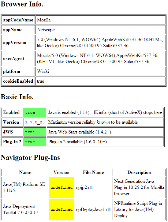 <li><b>Enabled</b>: Java is known to this browser and enabled, according to JavaScript <code>navigator.javaEnabled()</code>.</li>