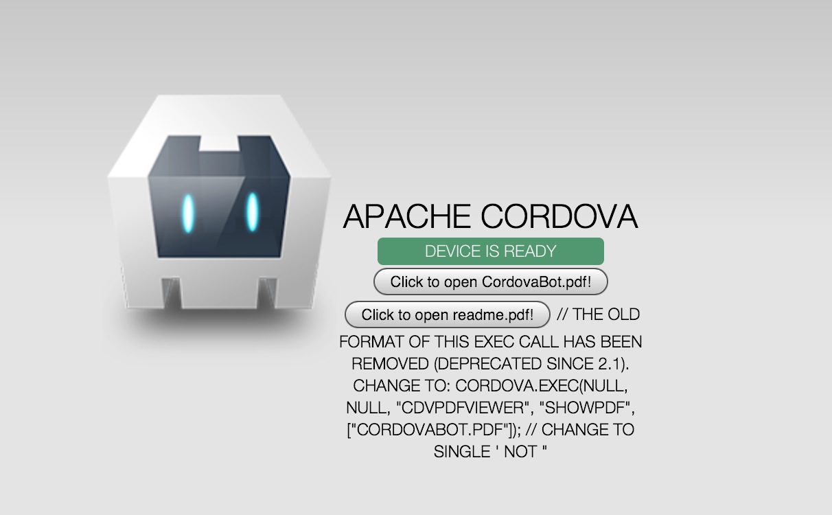 因此,我运行的PDF插件从这里,并按照指示,并将它添加到我的项目似乎一切正常,我得到下面的屏幕截图打开,但当我点击“点击打开CordovaBot.pdf!”我在我的控制台上看到这个错误,屏幕就冻结了: