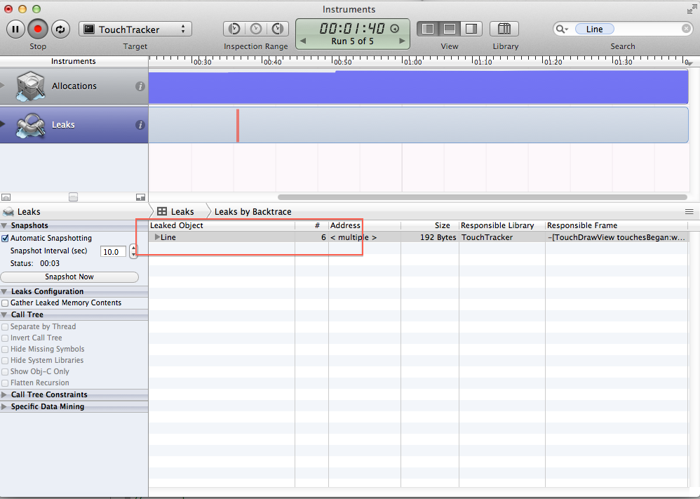 是的,您的代码中有内存泄漏,而红色垂直行在泄漏中显示了相同的内容。“泄漏对象”是层次结构,它将显示对象层次结构、泄漏发生的位置和方式。