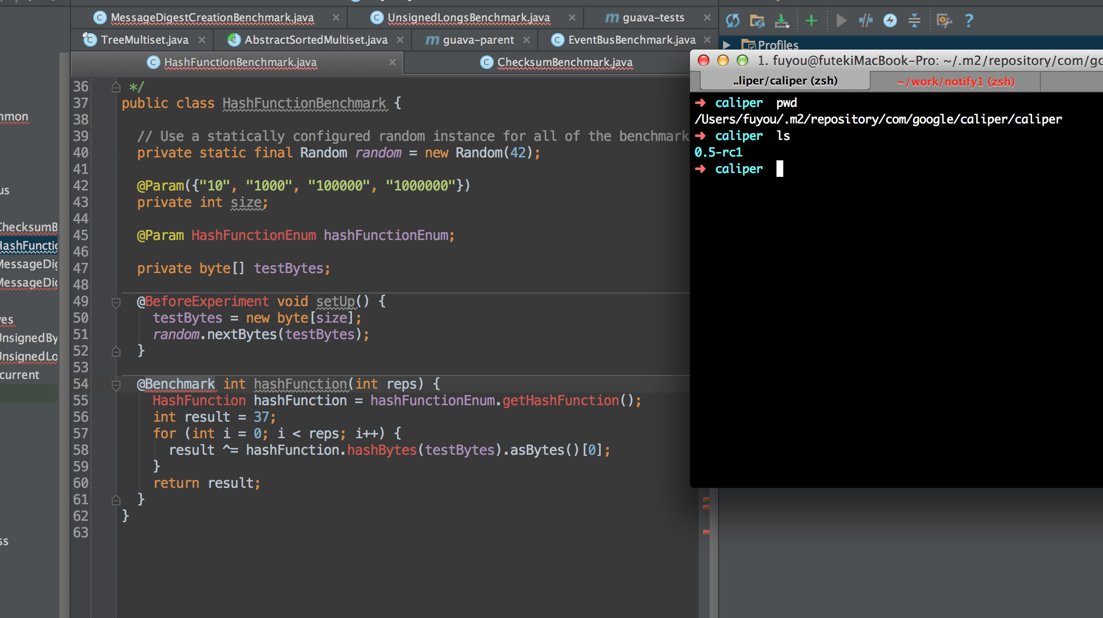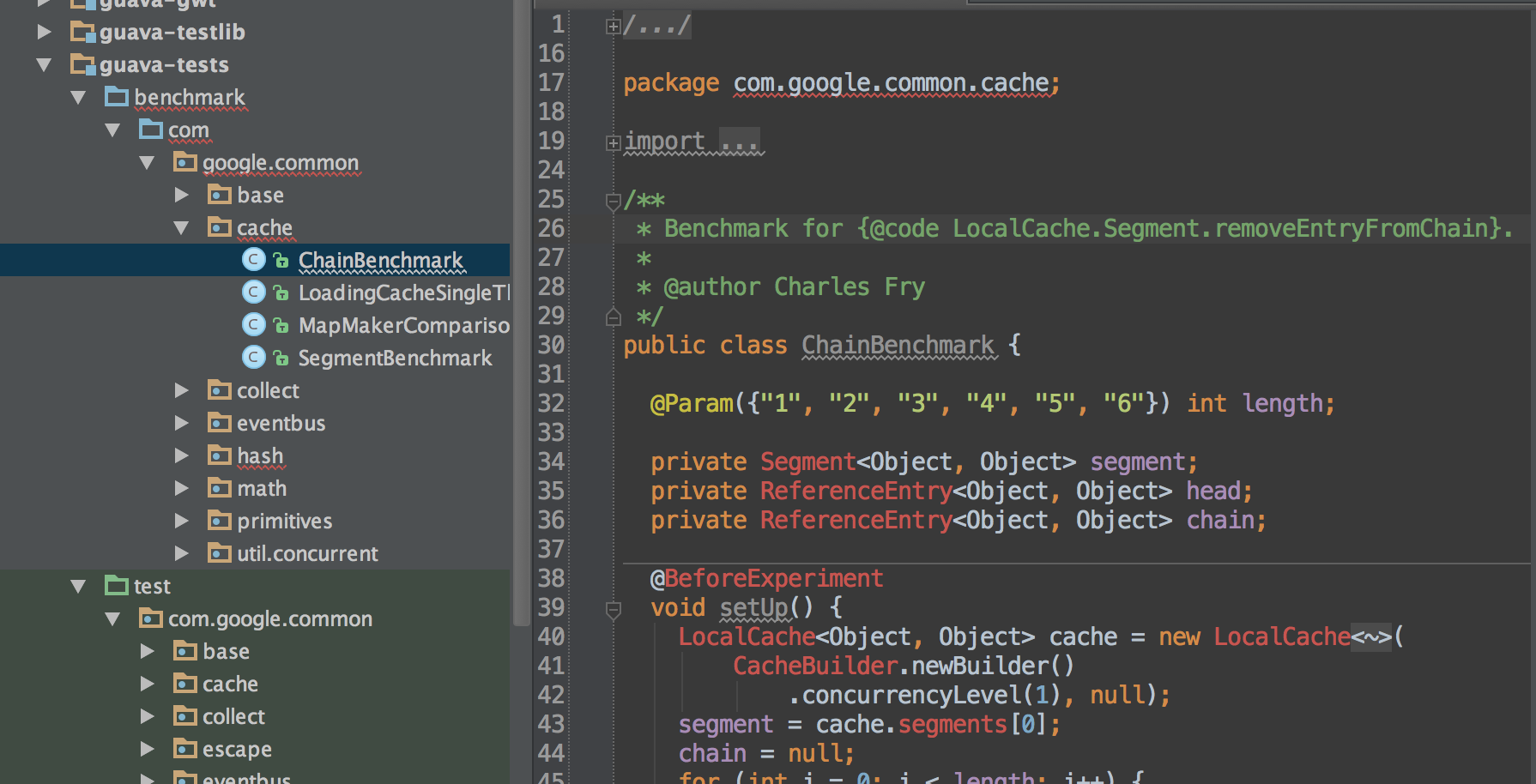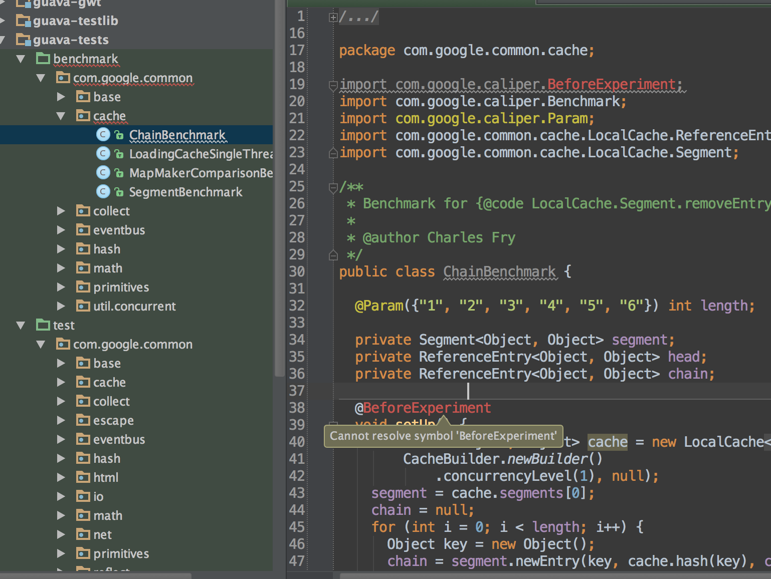 guava-tests/benchmark目录目前没有设置为Maven配置中的源根,因为它不会生成。尽管如此,我们只需要将一个新版本的Caliper推送到Maven Central,其中包括新的注释等等,我认为这应该很快就会发生。