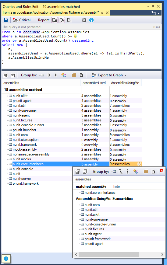 此外,由于NDepend API可以从C# LINQ查询中实时编译和执行,因此可以在Visual中的NDepend查询编辑器中运行以前的C# LINQ查询,并以方便的方式获得程序集依赖项:
