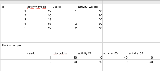 SUM(CASE WHEN activity_typeid=22 THEN activity_weight ELSE 0 END) activity22,