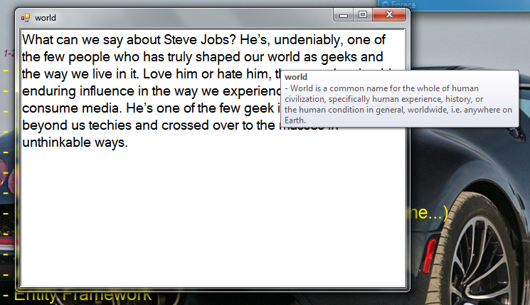 有点简单。您必须使用RichTextBox的RichTextBox方法来获取Mouse Pointer下面的Char index,做一些简单的循环来查找整个单词,然后通常在Tooltip popup中显示它。以下是代码: