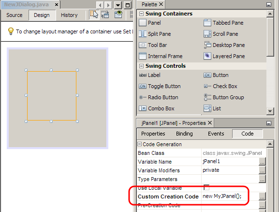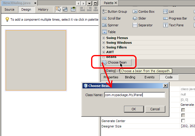单击OK后,可以将面板放置在窗体上,NetBeans将创建一个类型为MyJPanel (而不是JPane)的实例变量,并且可以访问该类中定义的所有方法。注意,必须先编译类,然后才能这样添加它!