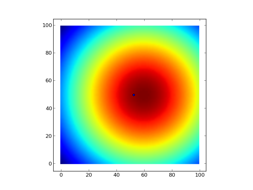 我试图用ndimage.measurements.center_of_mass计算高斯二维分布的峰值位置,发现质量中心从峰值中心移动: