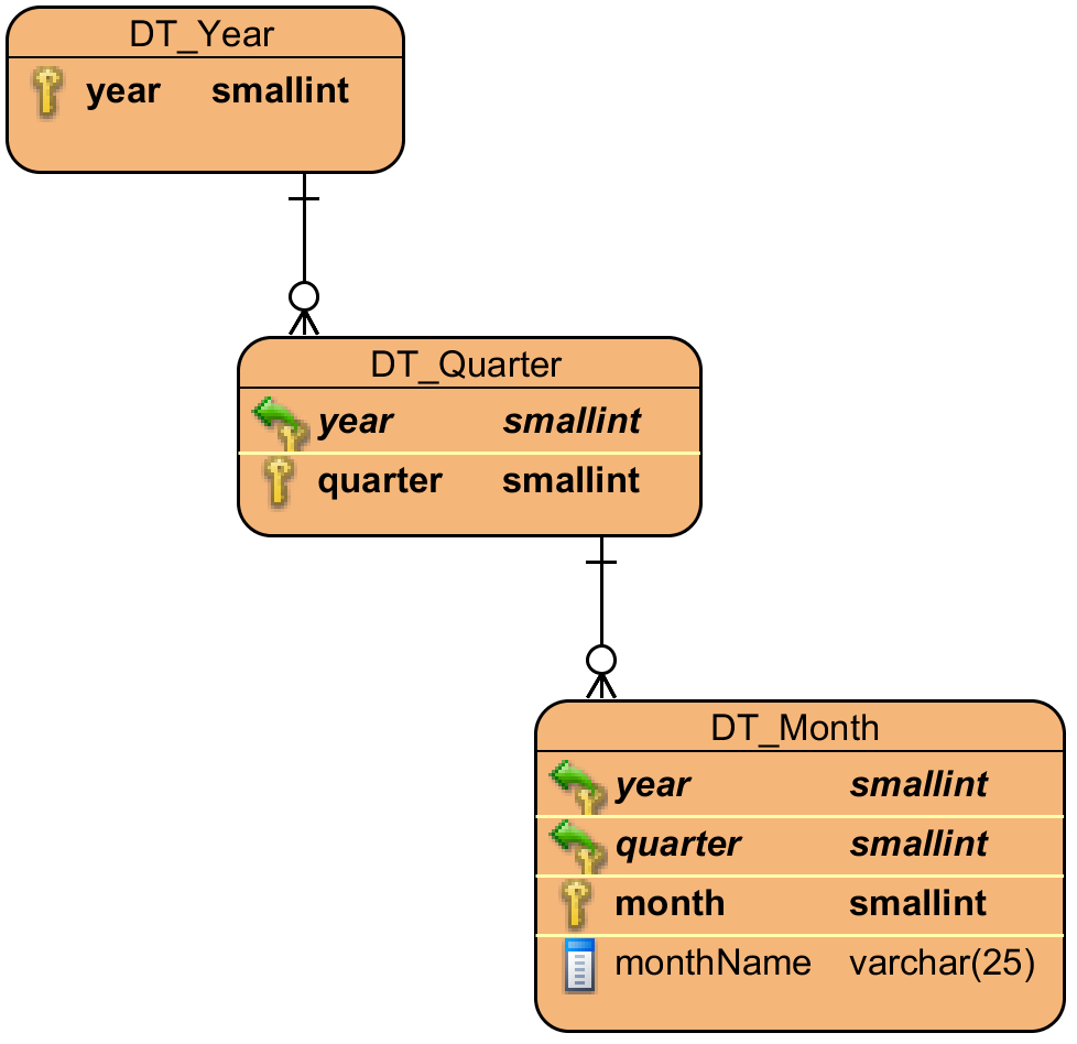 calendar_id是一个“智能密钥”,也就是说,它不是一个无意义的代理密钥。日历表是唯一应该使用智能键的表,因为它极大地帮助了表按日期进行分区。还请注意可空字段,它允许"N/A“(不可用)日期。没有0,所以0是一个很好的"N/A“值。