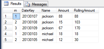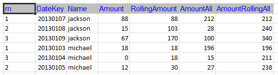 "RollingAmount" = SUM(Amount) OVER(PARTITION BY Name ORDER BY DateKey),