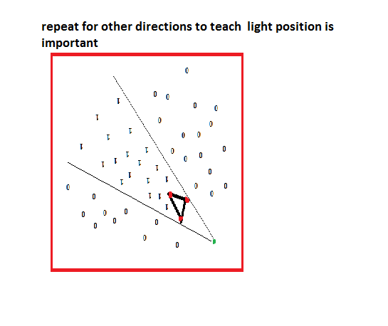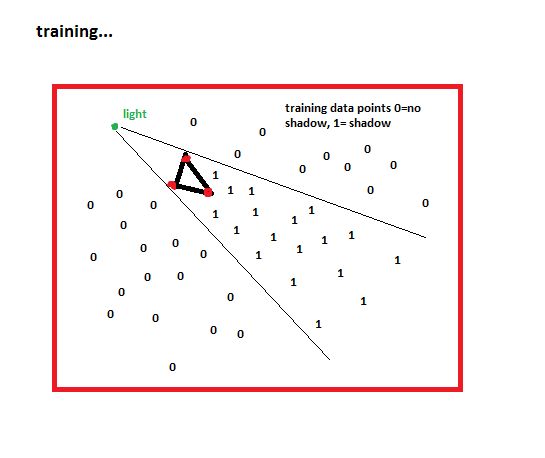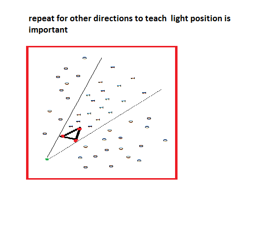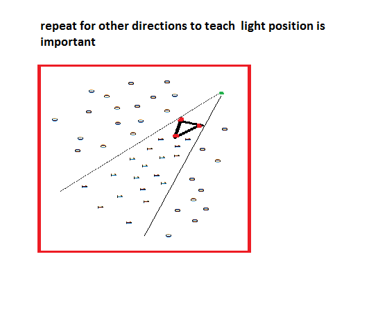 即使你尝试这样做,你对问题的描述也准备得很糟糕,网络不会通过向它展示这些数据来学习“影子的概念”,有两个模型可以用神经网络来表示与你的数据一致。即使是经过训练的网络的效率似乎也无法与“算法”替代方案相媲美。