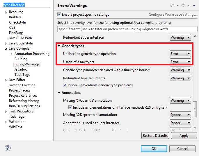 您可以对使用javac的原始类型发出-Xlint:rawtypes警告,在IDE中,您可能会使它成为一个实际的错误,但它仍然是基本有效的-Xlint:rawtypes。