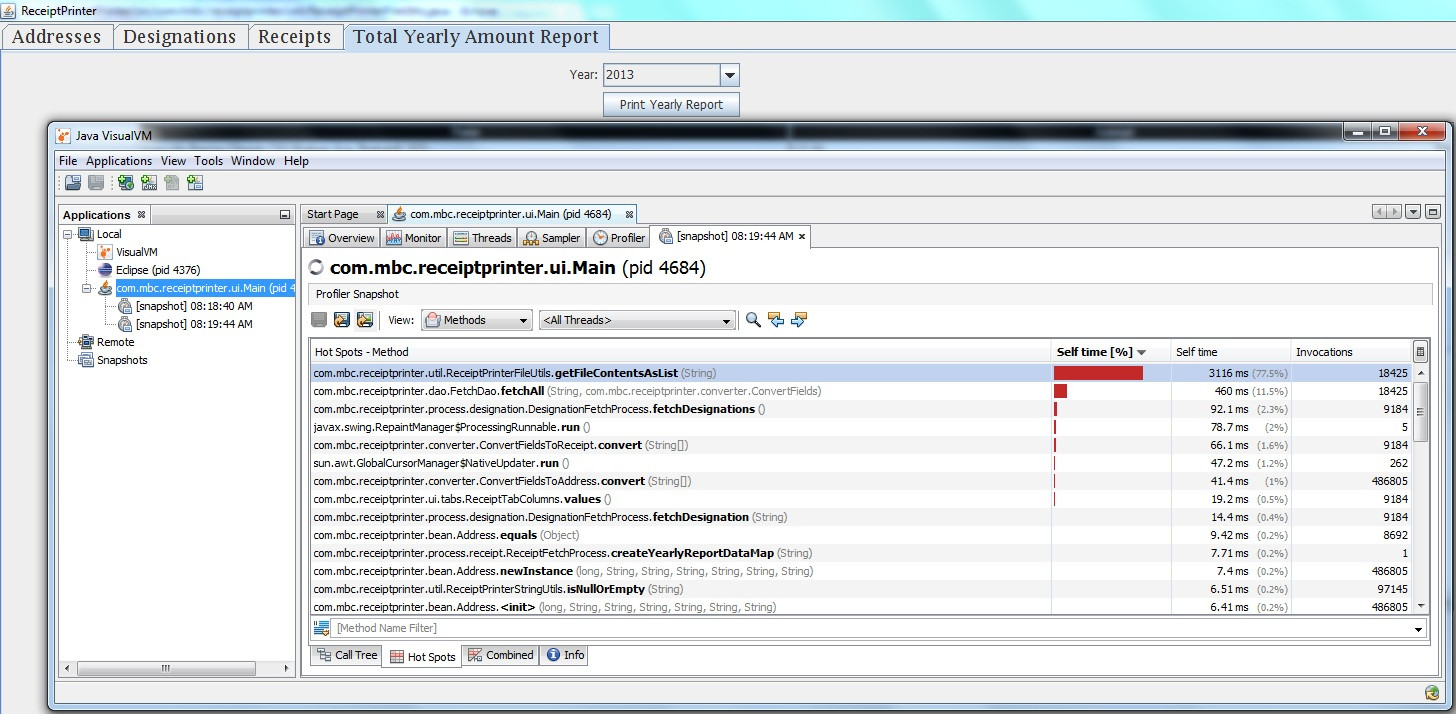 因此,如果您这样做的话,file.io就会变得非常昂贵--我在屏幕截图中看到了一个lot...as,而包含file.io调用的原始代码getFileContentsAsList被调用了很多次(18.425次)。VisualVM是指出这些瓶颈的一个真正的工具!