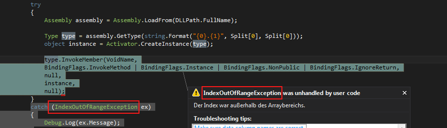 我知道Debug.Log(Test[4].ToString()); //Exception!!是错误的,并将调用excetpion (!)。是被通缉的。尝试{}块将工作,但请记住,脚本是由第三方制作的。我没有掌握这一点,但至少我不认为我们的应用程序正在吞噬错误(并将它们显示在richTextBox中),而不是抛出它们(=应用程序崩溃)。