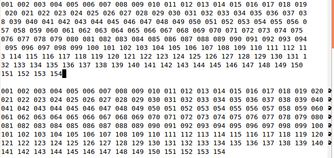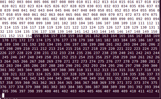 seq -w 1 999 | xargs echo > /tmp/f