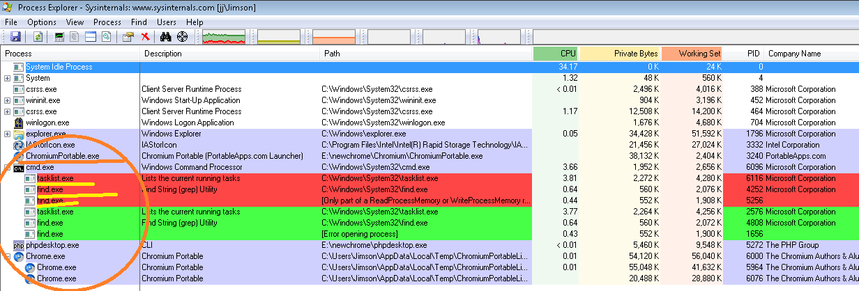发现的问题是它在循环中使用了find命令,从而导致了大量内存的使用。(我发现很少有在CMD.exe下运行的“查找”和“任务列表”命令)附带的屏幕截图。