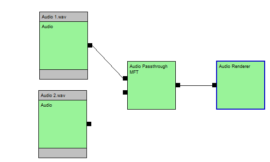 现在,我认为这可能是AudioMixerMFT的一些问题,所以我编写了一个带有2个输入的自定义MFT,它的作用就像一个简单的传递(只发送第一个输入&忽略第二个输入)。我在TopoEdit类中构建了一个拓扑结构,它起了作用:
