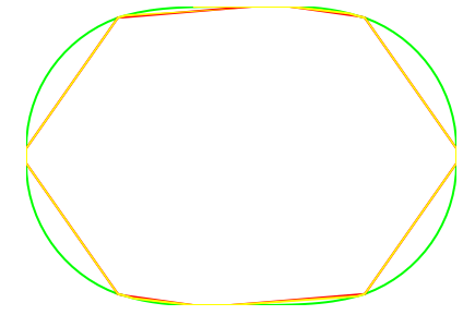@end效果如下,绿色是原始路径,红色是该方法生成的路径,黄色是使用setFlatness:MAXFLOAT生成的路径。