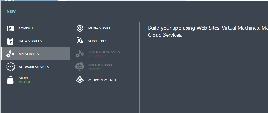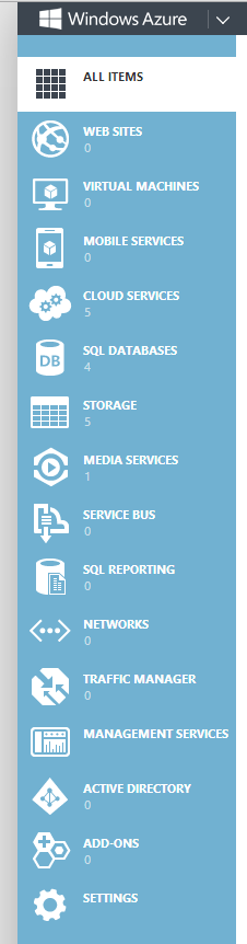 所有项目:网站、虚拟机、移动服务器、云服务、SQL数据库、存储、HDInsight媒体服务、服务总线、缓存服务、、CDN网络、流量管理管理服务、Active Directory Add-Ons