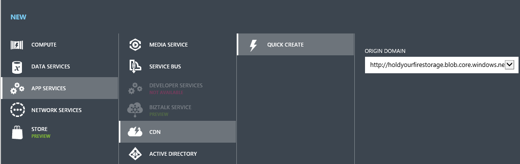 根据其他消息来源,“新->应用程序服务”菜单下应该有CDN选项,如下所示: