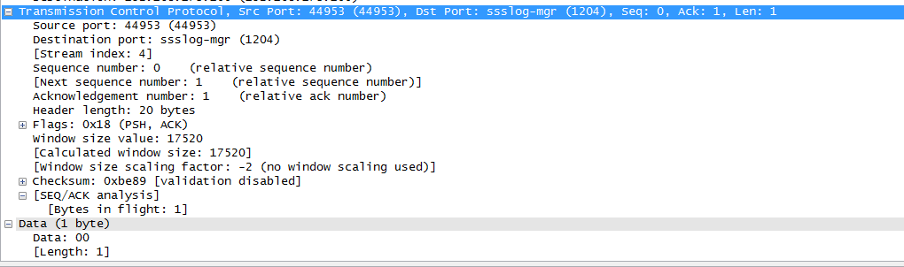 我在Wireshark上观察到一个保持生命的数据包,它有一个字节的数据,是"00“。
