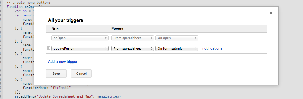 现在,在电子表格中,进入脚本编辑器(Tools > script ),选择参考资料菜单项,然后转到所有触发器。