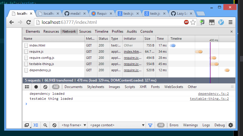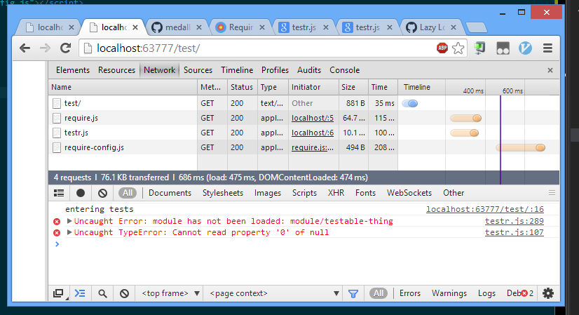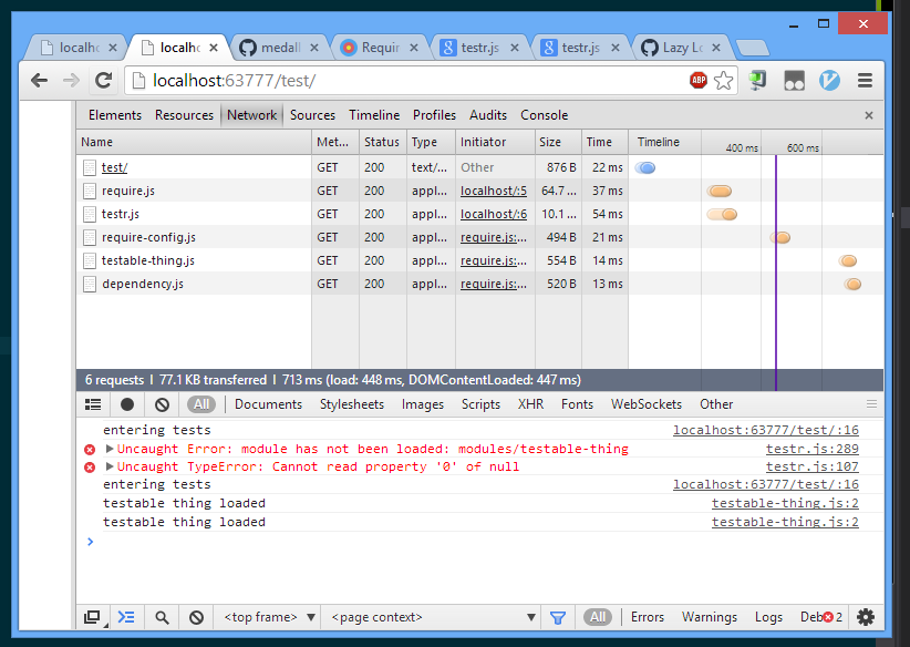 现在,我了解到testr.js覆盖RequireJS的require方法来注册加载了哪些模块,并用传递给testr函数的存根/模拟覆盖它们,但在我的一生中,我无法解决如何“加载”这些依赖项。如果我在test/index.html中修改test/index.html回调例程,以包含一些确实会加载依赖项的内容:
