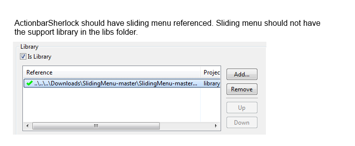 您自己的项目应该在自己的属性中引用ActionBarSherlock,如上面所示。ActionbarSherlock应该是libs文件夹中唯一具有android-support-v4.jar的项目。