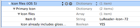 Icon files (iOS 5) -字典Primary Icon -字典Icon files阵列Item 0 - String = AppIcon57x57.png以及彼此的项目/应用程序图标。现在,当您最终归档您的项目时,最终的.xcarchive有效载荷.plist现在将包括上述要构建和使用的图标位置。