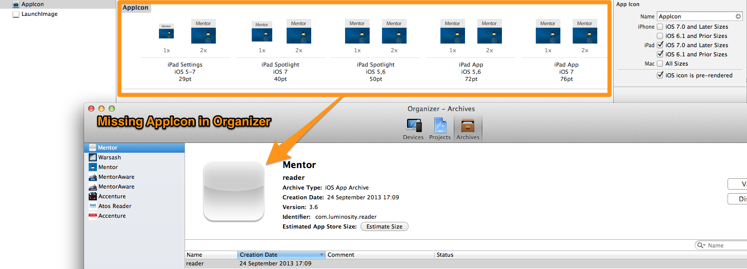在项目设置中定义图标有两种方法:CFBundleIconFiles自iOS3,CFBundleIcons自iOS5。年龄越大的人,尽管年龄越大,就越不习惯于向后兼容,即仍居优先。在直接迁移到Asset之前,我使用了CFBundleIcons。迁移之后,我删除了CFBundleIcons指向的原始文件,因为,你知道,现在我有了闪亮的新资产目录,对吗?和XCode做了三件事: