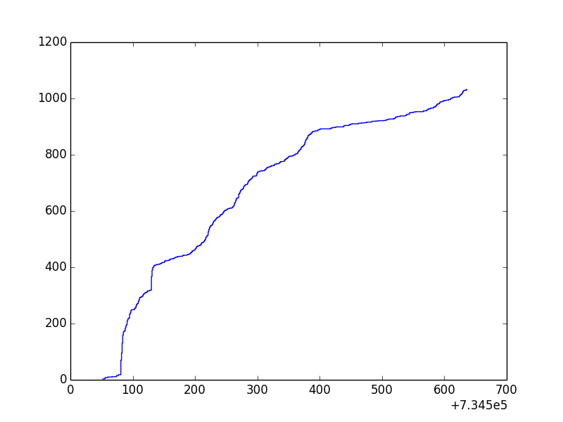 我绘制这幅图的第一个想法是,首先为可能的日期范围内的每一天创建一个具有0值的Numpy数组,然后循环遍历所有日期并增加相应的数组项。然后可以使用numpy.cumsum(y)绘制此图。