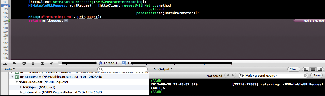 如您所见,当调试器声明url请求指向有效的内存地址时,日志将输出一个null值。我正在用Xcode 4.6.3在iOS 6.0上运行我的项目。你知道问题是什么吗?