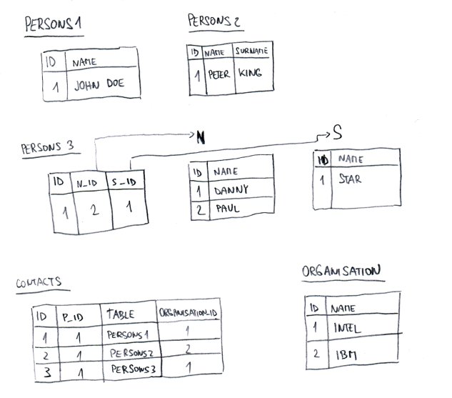我有一些表具有不同的结构,但包含相同的数据(在示例中是名称和姓氏)。