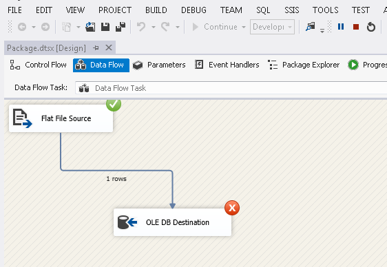 SSIS包"C:\Users\USRNAME\Desktop\Projects\DataGeneratorSsis\DataGeneratorSsis\Package.dtsx“启动。信息: 0x4004300A在数据流任务,SSIS.Pipeline:验证阶段已经开始。信息: 0x4004300A在数据流任务,SSIS.Pipeline:验证阶段已经开始。警告: 0x80047076在数据流任务中,SSIS.Pipeline:输出“平面文件源输出”(6)和组件“平面文件源”(2)上的输出列"intApplication“(7)随后不在数据流任务中使用。删除此未使用的输出列可以提高数据流任务的性能。信息: 0x40043006在数据流任务,SSIS.Pipeline:准备执行阶段正在开始。信息: 0x40043007在数据流任务,SSIS.Pipeline:预执行阶段已经开始.信息: 0x402090DC在数据流任务,平面文件源2:文件"C:\Users\USRNAME\Desktop\ddd.txt“的处理已经开始。信息: 0x4004300C在数据流任务,SSIS.Pipeline:执行阶段已经开始。信息: 0x402090DE在数据流任务,平面文件源2:为文件"C:\Users\USRNAME\Desktop\ddd.txt“处理的数据行总数为2。错误: 0xC0202009在数据流任务,OLE DB目的地43: SSIS错误代码DTS_E_OLEDBERROR。发生了OLE DB错误。错误代码: 0x80040E21。OLE DB记录是可用的。来源:“11.0”H结果: 0x80040E21描述:“多步OLE DB操作生成错误。如果可用,请检查每个OLE DB状态值。没有完成任何工作。”错误: 0xC020901C在数据流任务,OLE DB目的地43: OLE DB Destination.InputsOLE DB目的地Input.ColumnsAppID在OLE DB Destination.InputsOLE DB目的地输入上出错。返回的列状态是:“由于数据可能丢失,无法转换值”。错误: 0xC0209029在数据流任务,OLE DB目的地43: SSIS错误代码DTS_E_INDUCEDTRANSFORMFAILUREONERROR。由于发生了错误代码0xC0209077,"OLE DB Destination.InputsOLE DB目标输入“失败,而"OLE DB Destination.InputsOLE DB目标输入”上的错误行处理指定错误失败。指定组件的指定对象上发生错误。在此之前可能会发布错误消息,并提供有关故障的更多信息。错误: 0xC0047022在数据流任务,SSIS.Pipeline: SSIS错误代码DTS_E_PROCESSINPUTFAILED。组件"OLE DB目标“(43)上的ProcessInput方法失败,错误代码0xC0209029在处理输入"OLE DB目标输入”(56)时失败。标识的组件从ProcessInput方法返回一个错误。错误是特定于组件的,但是错误是致命的,将导致数据流任务停止运行。在此之前可能会发布错误消息,并提供有关故障的更多信息。信息: 0x40043008在数据流任务,SSIS.Pipeline:后执行阶段已经开始。信息: 0x402090DD在数据流任务,平面文件源2:文件"C:\Users\USRNAME\Desktop\ddd.txt“的处理已经结束。信息: 0x4004300B在数据流任务,SSIS.Pipeline:"OLE DB目的地“写了0行。信息: 0x40043009在数据流任务,SSIS.Pipeline:清理阶段已经开始。任务失败:数据流任务警告: 0x80019002在包: SSIS警告代码DTS_W_MAXIMUMERRORCOUNTREACHED。执行方法成功,但引发的错误数(4)达到允许的最大值(1),导致失败。当错误数达到MaximumErrorCount中指定的数目时,就会发生这种情况。更改MaximumErrorCount或修复错误。SSIS包"C:\Users\USRNAME\Desktop\Projects\DataGeneratorSsis\DataGeneratorSsis\Package.dtsx“完成:失败。