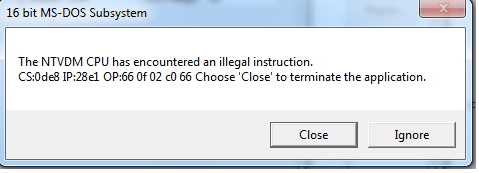 如果这没有帮助的话,在这里看看,试试这些人发现的任何东西:http://social.msdn.microsoft.com/Forums/en-US/e5466e39-29b2-4667-96c4-6bacd8a397d4/the-ntvdm-cpu-has-encountered-an-illegal-instruction-error-message-pops-up-when-installing-visual?forum=vssourcecontrol