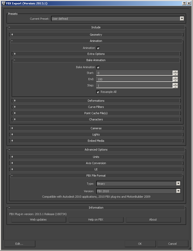 我已经成功地获得转换动画导出ok,例如,如果有东西正在移动。但是某些东西上的动画参数似乎并不能导出,例如盒子的高度。以下是我的fxb导出设置