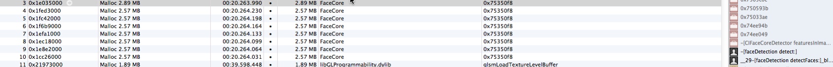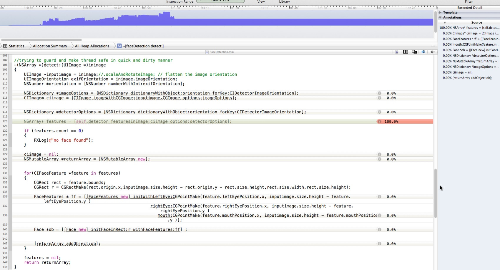}但是,在出现了各种内存问题之后,根据仪器公司的说法,NSArray* features = [self.detector featuresInImage:ciimage options:detectorOptions];似乎没有发布
