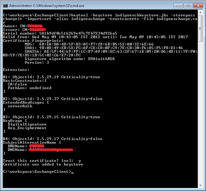 at com.xyz.cms.test.ExchangeDevelopmentTest.main(ExchangeDevelopmentTest.java:31)因此,我想这与解析证书有关,而且由于上述线程上的人得到了类似的异常,我正在尝试那里建议的解决方案--使用keytool.exe下载证书并将证书添加到私有程序,尽管我真的认为我还没有完全理解证书内容和keytool。