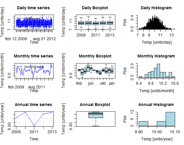 hydroplot(Tempzoo, na.rm=TRUE, ptype="ts+boxplot+hist", pfreq="dma",