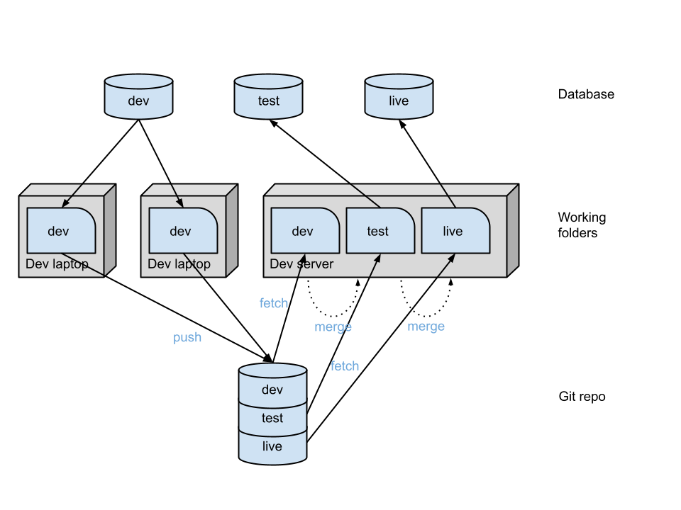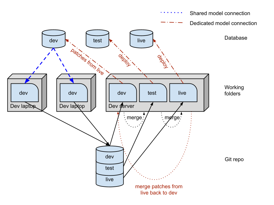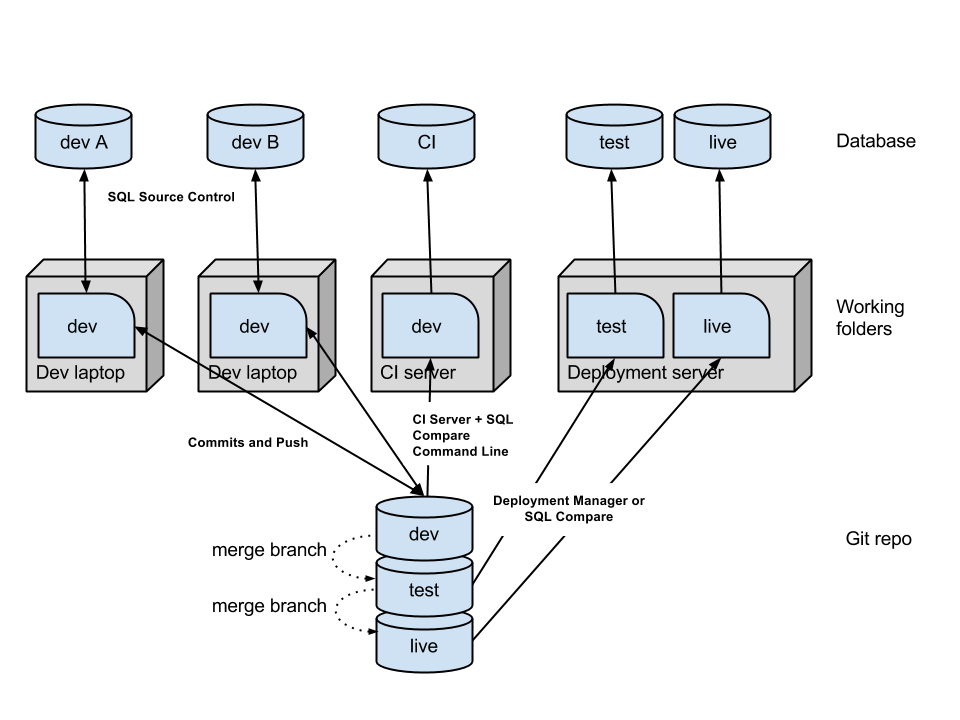 我画了一个图解,对你的画做了一些调整。不确定您是否在使用CI服务器,但我已经添加了它也适用于流程中的位置。这个关系图假设了两个开发人员的专用模式,但这可能是一个共享数据库。