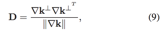 给Eq的。(9)我向你提出一个小把戏。与图像梯度正交的各向异性扩散(此处为nabla k)可作为中值滤波实现。所以我建议你用一些中值滤波迭代来代替各向异性扩散求解器(也就是,应用它大概10次)。这将避免你与这里所涉及的数学斗争。