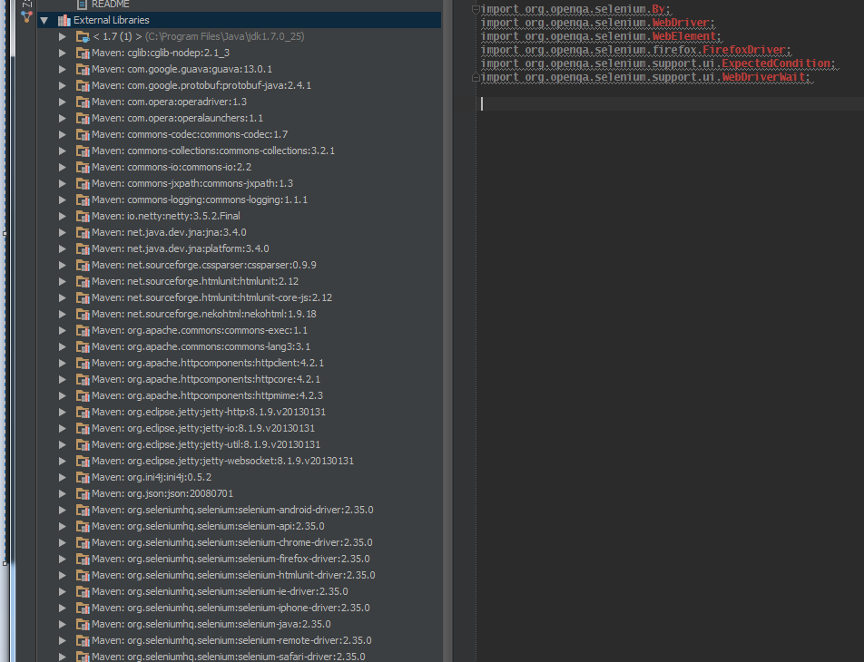 所以我想从Python + Selenium转到Java + Selenium。我决定跟踪Selenium文档并使用Maven。我使用Intellij作为我的IDE。我创建了项目目录,将取自此链接的此链接中的selenium-java工件的版本更改为2.35.0。然后我做了