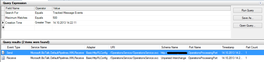 我正在发送一条信息到BizTalk接收位置,它被卡在某个地方。查询跟踪的消息事件将给我以下信息: