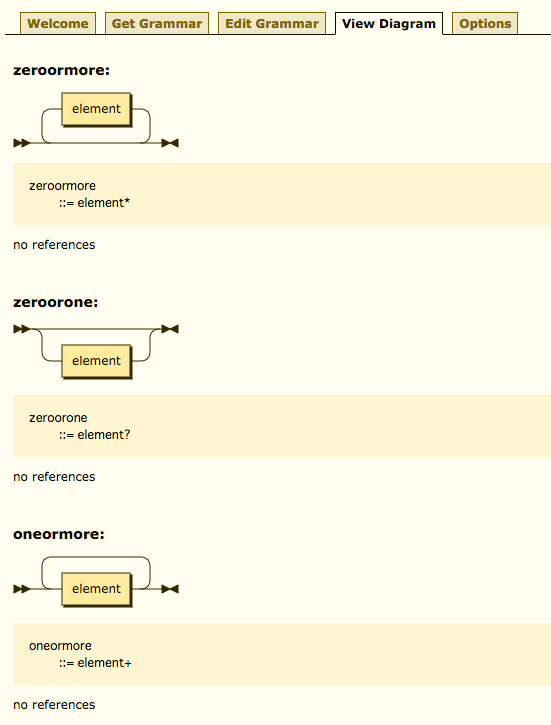 首先,正如@ChuckCottrill所提到的,您应该对语法图和BNF/EBNF有一个基本的认识。但读了之后,我仍然很困惑,直到我比较了三张不同情况的图表: