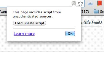 最近(比如上个月),Chrome(和Firefox)的安全设置发生了一些变化,使得它不再自动运行这个脚本。相反,默认情况下,我上传脚本的某些部分会被阻塞。这意味着上传失败,除非您单击显示在URL栏右侧并显式允许脚本运行的屏蔽(请参阅附件)。