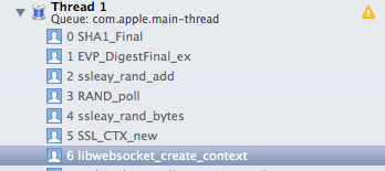 我尝试用一个视图创建简单的测试项目,其中只有libwebsocket和openssl库,而在该项目中,openssl不会崩溃。