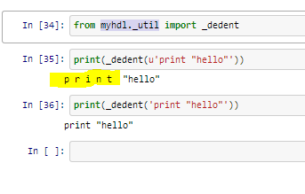 这看起来像是myhdl._util._dedent()中unicode支持的一个问题。